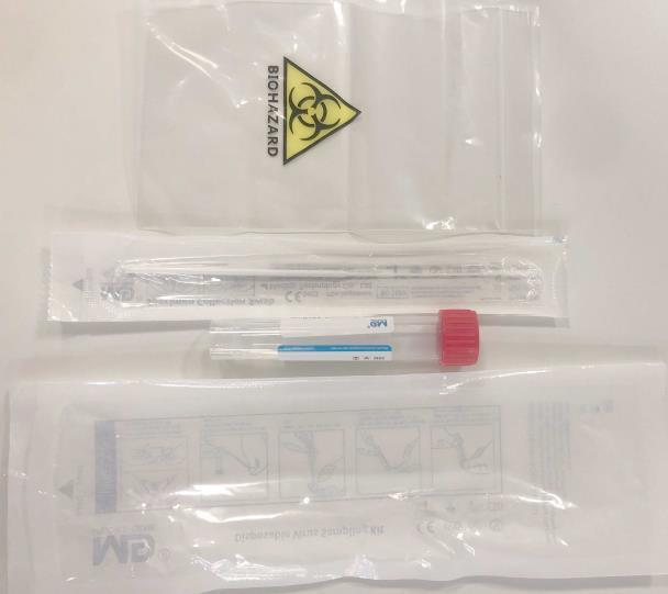 Kit hisopo para toma de muestras nasofaríngeas con medio de transporte sin solución inactivadora para virus. Hisopo de nylon, flocado, con punto de rotura, libre de látex y estéril.